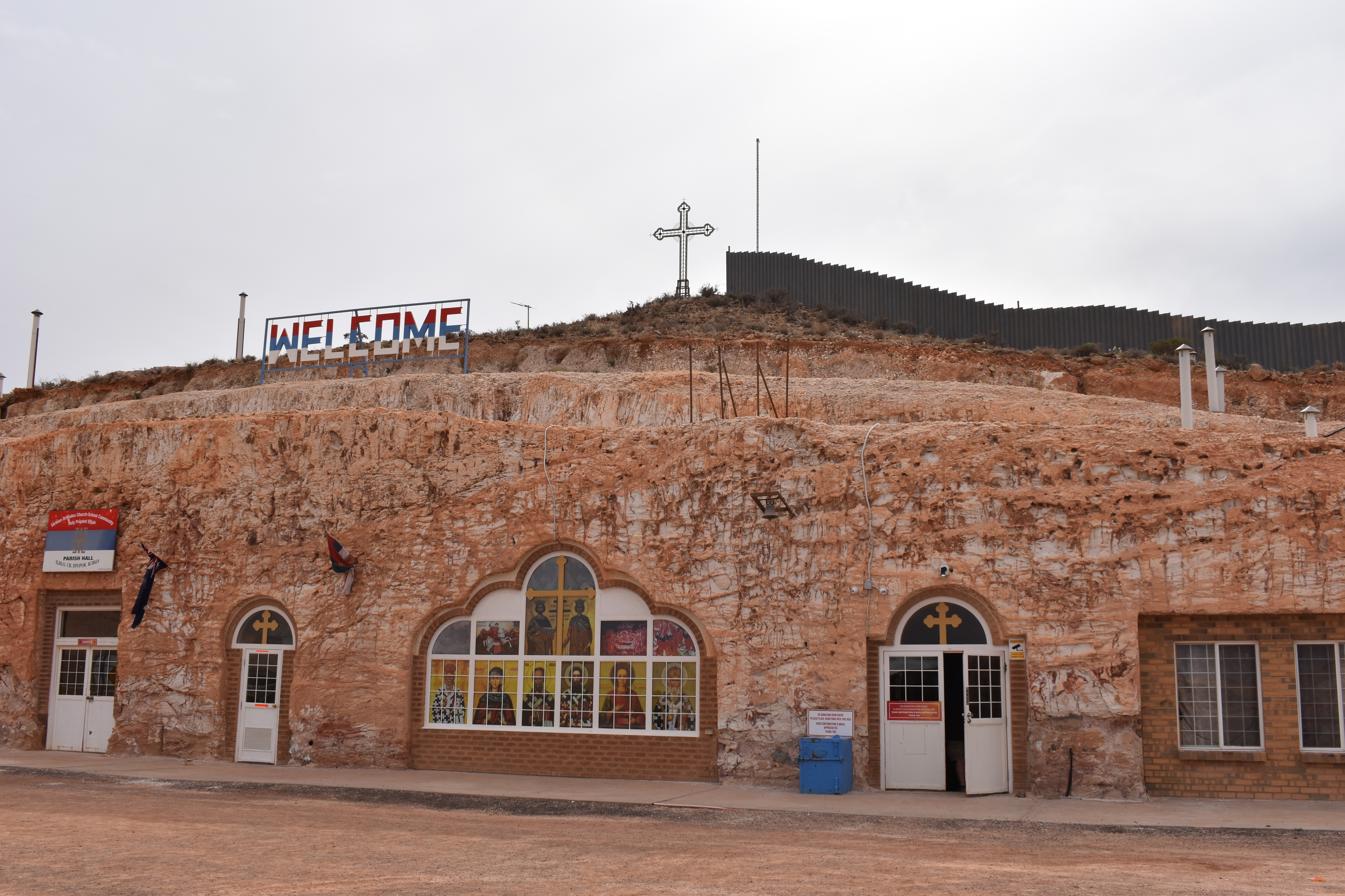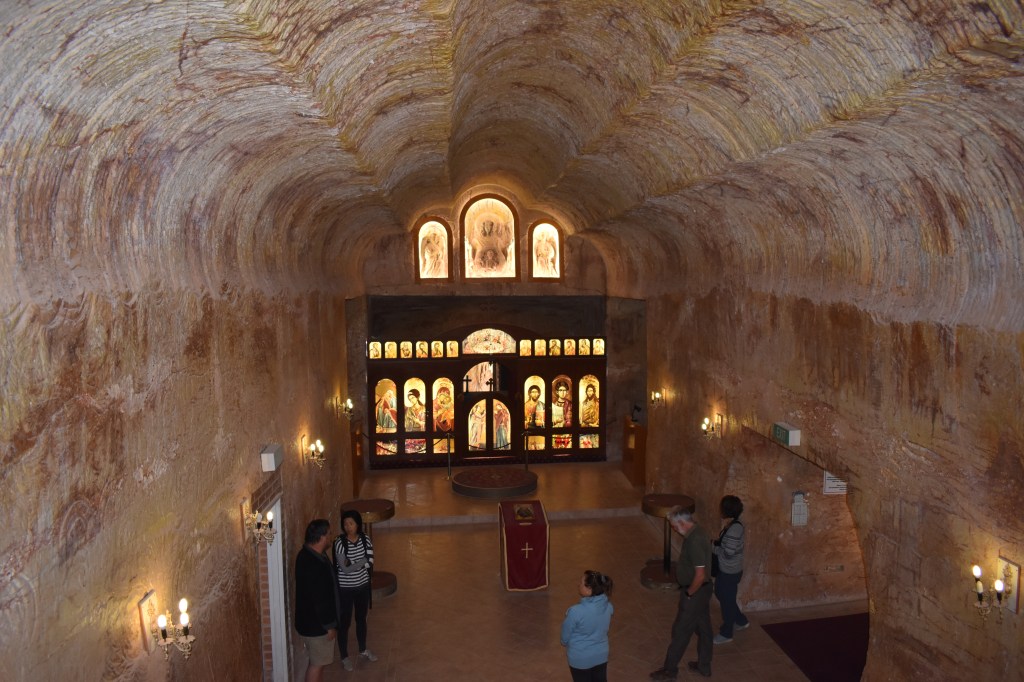 We toured the town observing many quirky structures and visited an underground mine and showroom and a Serbian Church. We also visited the Breakaways to take in the vista and enjoy a champagne. The golf course does not have a blade of grass on it. We also saw the “Dog Fence “which at over 5,300 kilometres (about the width of the United States) is the longest manmade structure in the world! It was built to keep the dingoes out of sheep grazing country and spans 3 Australian states.