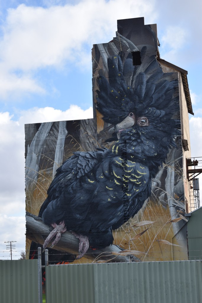 Further west of Murtoa is the the town of Horsham, where we shopped at the supermarket, used a laundromat and dined at a nice but expensive café. The Horsham silo art is a magnificent picture of a black cockatoo and an aboriginal man.