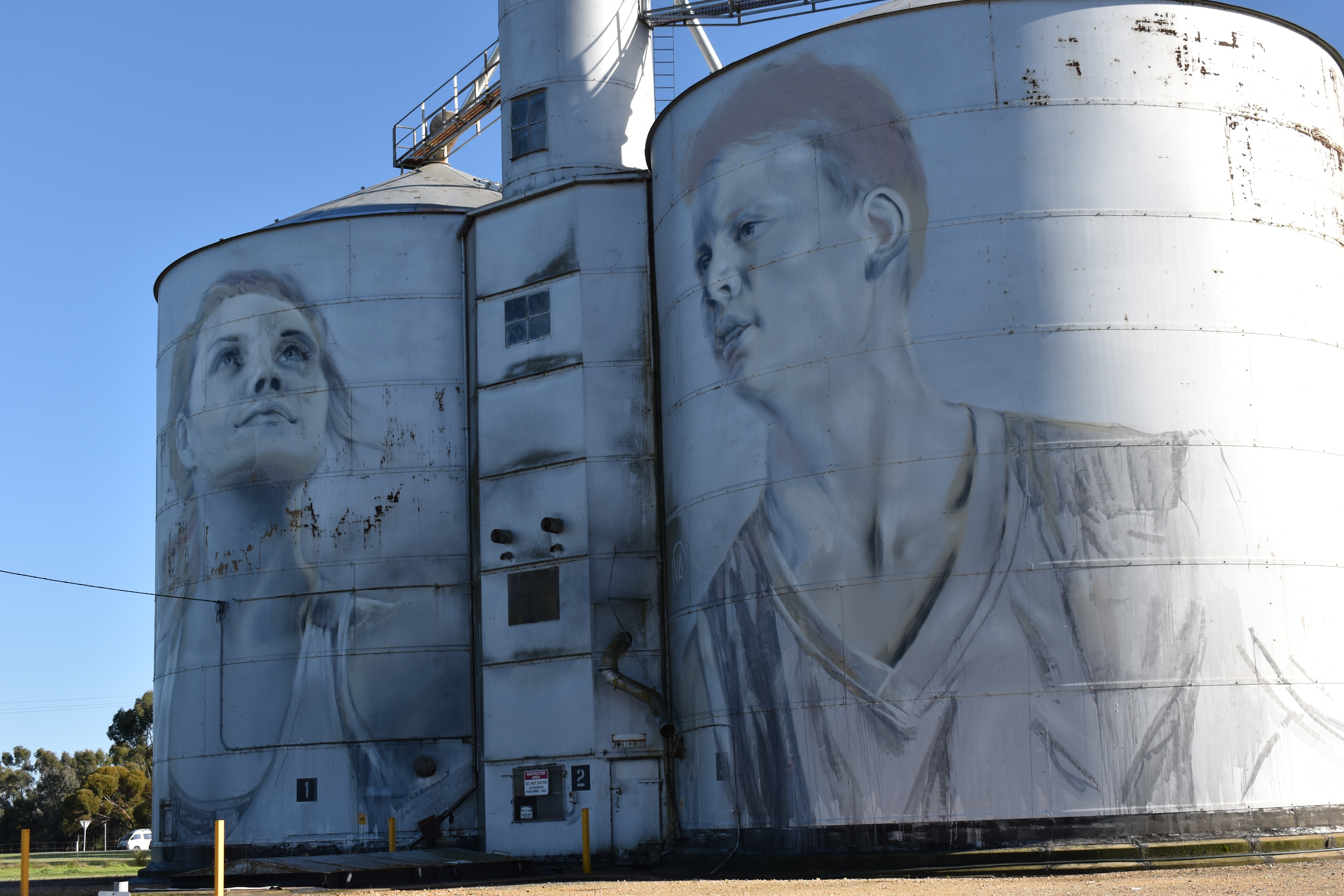 Rupanyup is a small wheatbelt town in an area that now specialises in growing lentils, chickpeas and beans. In 1998 it became famous as the town to challenge the quartet of big banks by opening the first branch of the Bendigo Bank Community bank. Today it is a quiet service town with a pub, a supermarket, a takeaway, bank, post office and newsagency, surrounded by bushland. The silo art in Rupanyup was created by a Russian mural artist and depicts two local sporting team members. Rupanyup also has a Fireman mural and numerous wooden carvings.